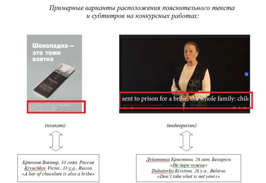 1.5. Конкурсные работы (плакаты и видеоролики) принимаются на сайте конкурса www.anticorruption.life на официальных языках Организации Объединенных Наций: английском, арабском, испанском, китайском, русском, французском.